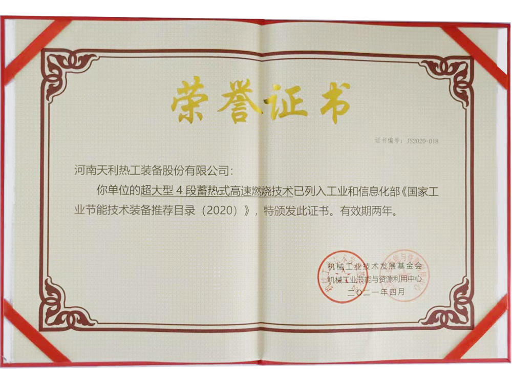 蓄熱式高速燃燒技術-國家節能證書